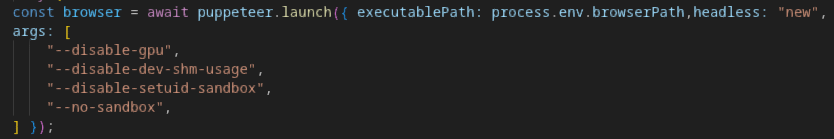 Then when puppeteer runs the browser, set the path to previsouly installed chromium and set arguments suitable for running in docker environment.