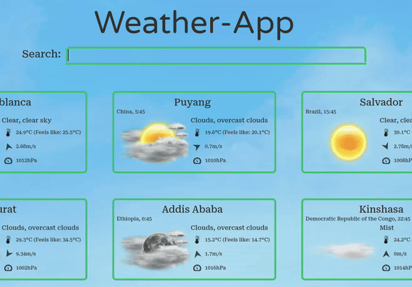 The crucial part of the app is the searchbar in the middle. I uploaded a list of more that 70 thousands city into my database, so every city is easily found by the opeweathermap api. Searchbar options contain links to selected city details.