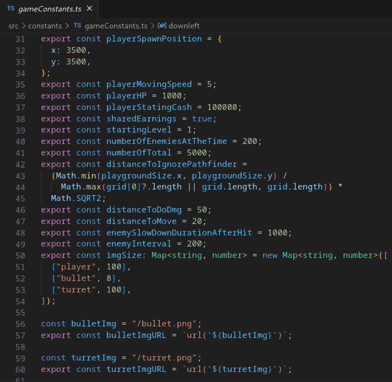 where 0 is available for every object. 1 is for walls, which is restricted for all. 2 is the out of the map and is restricted for players but available for monsters and bullets. Both monsters and players have functions to determine on which tile they are located. Monsters then need pathfindig to find the player. For pathfindig I used easystarjs. To use easystarjs, monster iterates through players on the Playground to find the closest player, then it calculates its tile and sets it as a start for the pathfinder and asks the player for its tile to set it as the destination. Easystarjs calculates the route and return an array of the tiles to the destination. Monster then calculates the direction to move while moving tile index when tile of pathfinder is reached. When the distance between the player and the monster is less then certain amount, the pathfinder is no longer called and the monster directly follows the player.